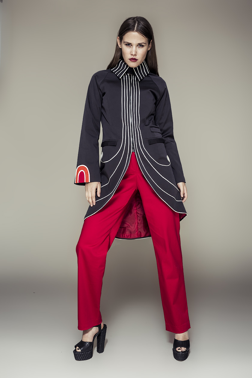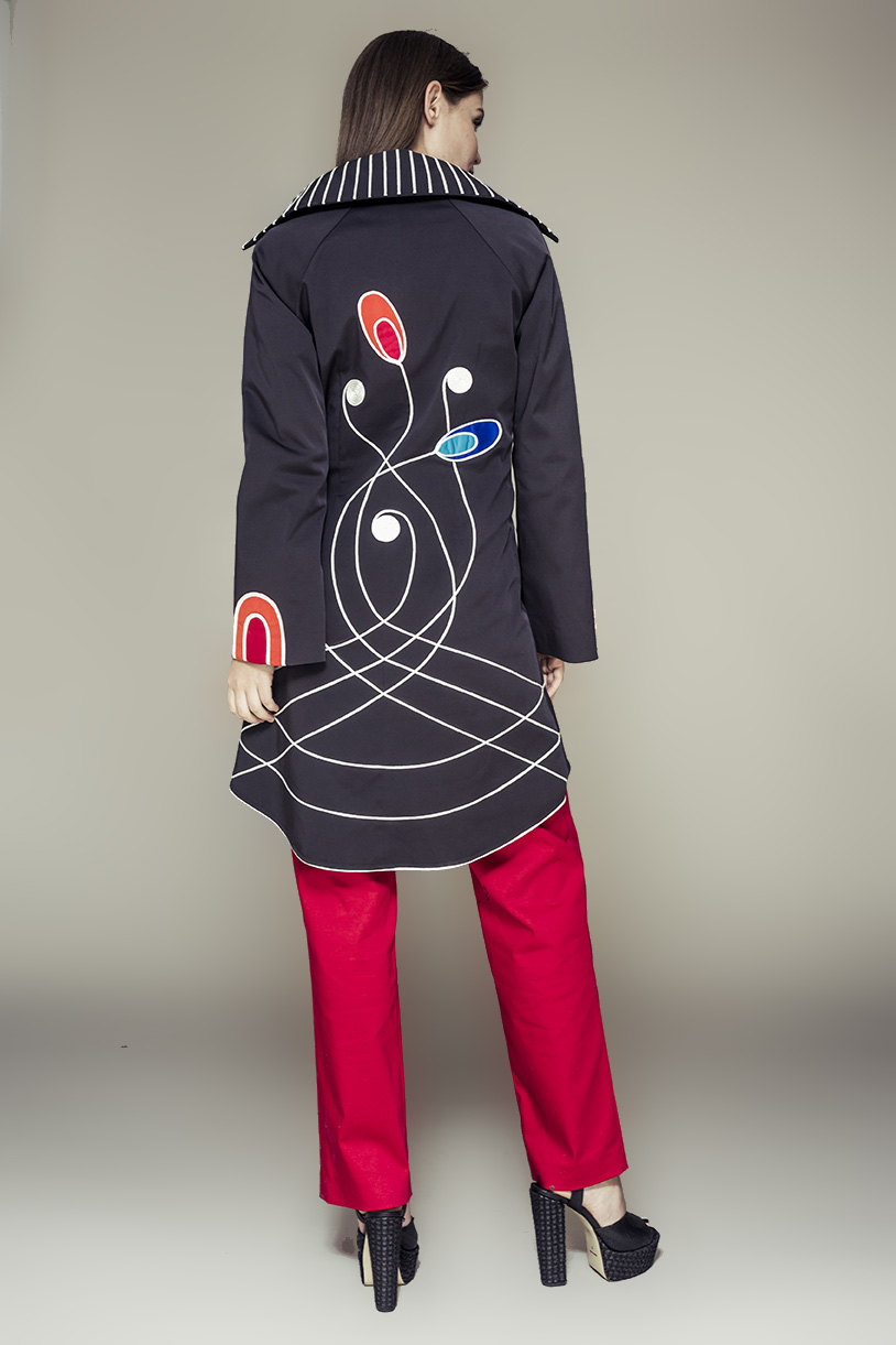 Long jacket with curved hem from the center of the front where the zipper ends, shirt collar with extra Velcro, 2 inserted pockets with flaps. embroidered in silk thread and tissue throughout the garment.